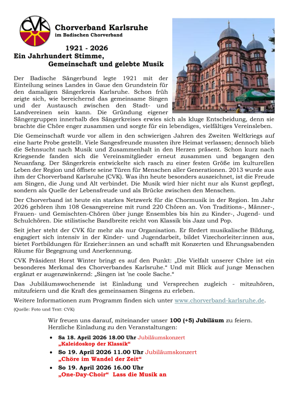 Sa 18. April 2026 14.00 Uhr Mitgliederversammlung des CVK
